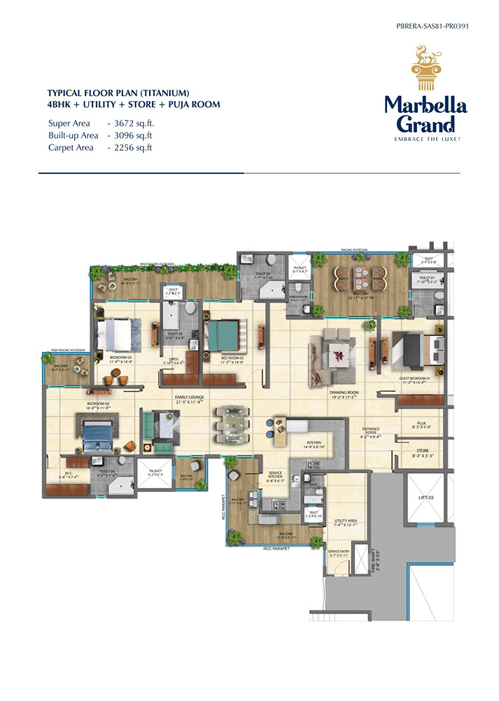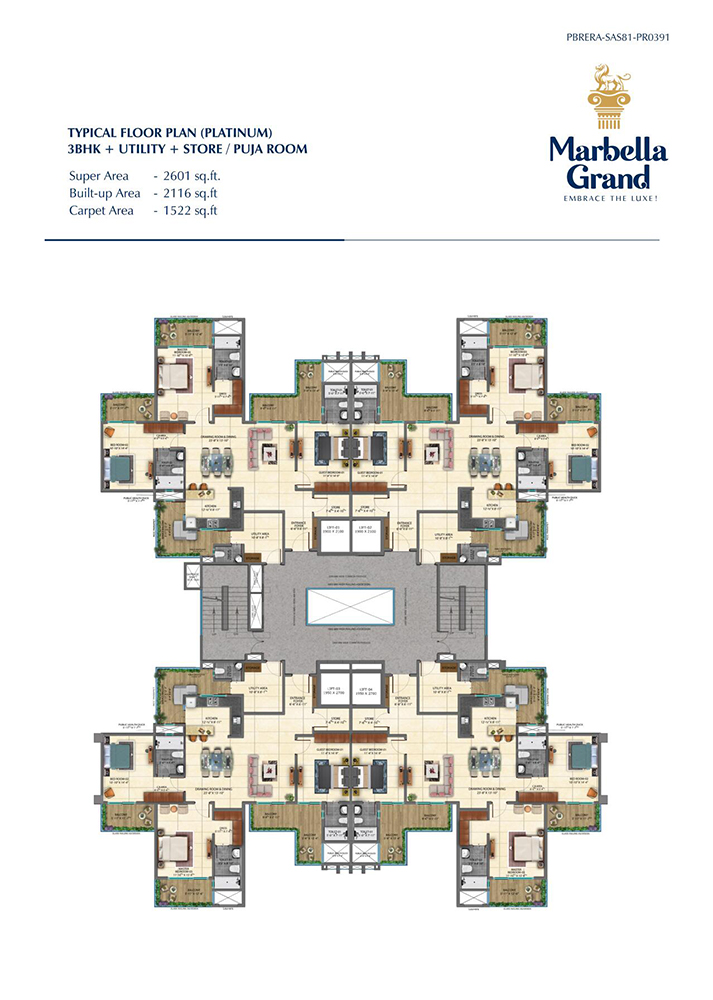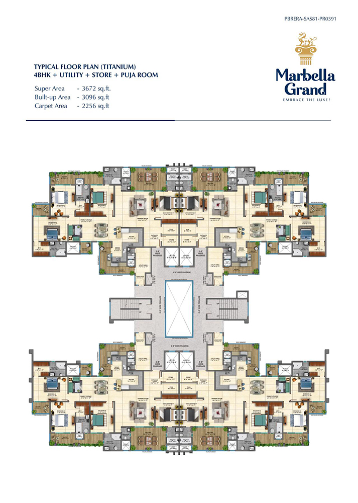 Marbella Grands every unit is designed to offer you a fine living experience. It is just the way you have imagined your home to be. As you walk into 3/4/5 BHK unit, space will speak for itself from every nook and corner. High ceilings, spacious rooms, blended hues, intricate designs, and the flow from one room to another is an epitome of stylish urbane living. With ample windows and glasses, your home will always have fresh air and plenty of natural light to brighten up the living space and your heart. The luxurious and comfortable living is symbolized by the single pillar of strength which supports them. This is also the pillar upon which Great Marbella Grand has been built upon!
